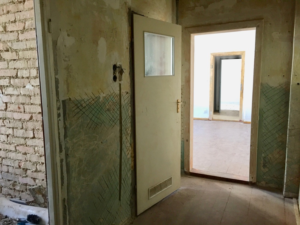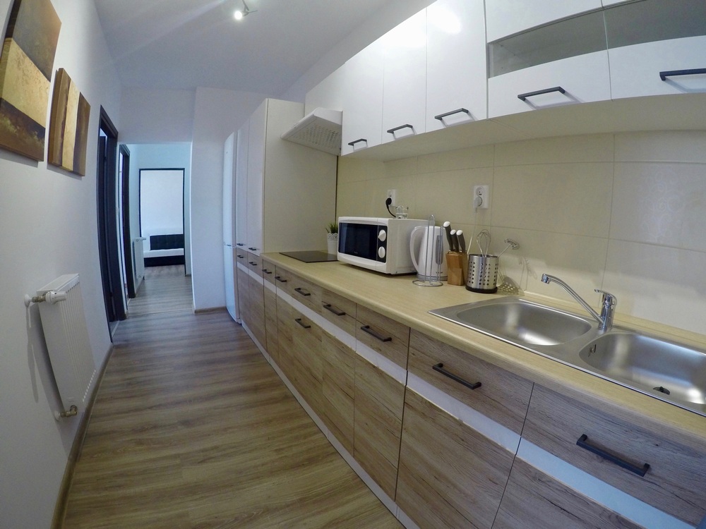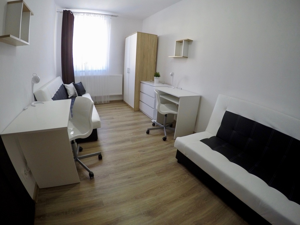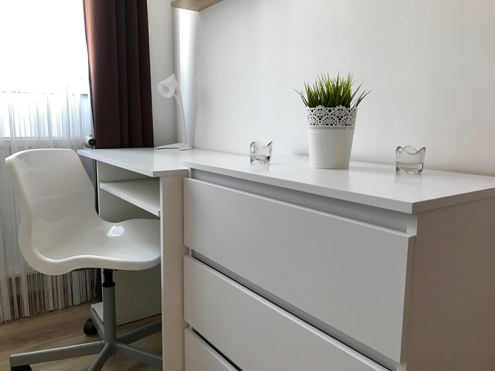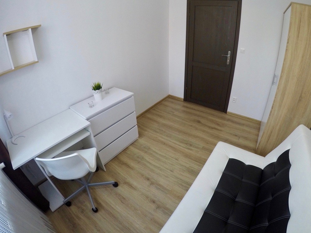 Mieszkanie o powierzchni 70 m2 znajduje się na pierwszym piętrze w budynku wielorodzinnym, zostało przez nas zakupione na rynku wtórnym. Jest to jedno z pierwszych lokali, jakie zdecydowaliśmy się zmodernizować pod wynajem na pokoje. Poprzedni właściciele zdecydowali się na remont, który częściowo zaczęli poprzez zbijanie tynków i próbę położenia nowej instalacji elektrycznej, ale nigdy nie ukończyli. Nasze prace w pierwszym etapie polegały na wydzieleniu odrębnych pokoi poprzez zbudowanie nowych ścian działowych, wymianie stolarki okiennej i drzwiowej, ponowne wykonanie instalacji elektrycznej oraz oblamowanie wszystkich ścian. Kompletnej metamorfozie uległa również łazienka, która zyskała zupełnie nowy wygląd, zmieniliśmy również sposobu ogrzewania mieszkania na bardziej oszczędne i ekologiczne ogrzewanie gazowe. W kolejnym etapie prac zostały położone jednolite podłogi we wszystkich pomieszczeniach z wyjątkiem łazienki oraz złożone meble i zamontowany sprzęt AGD.