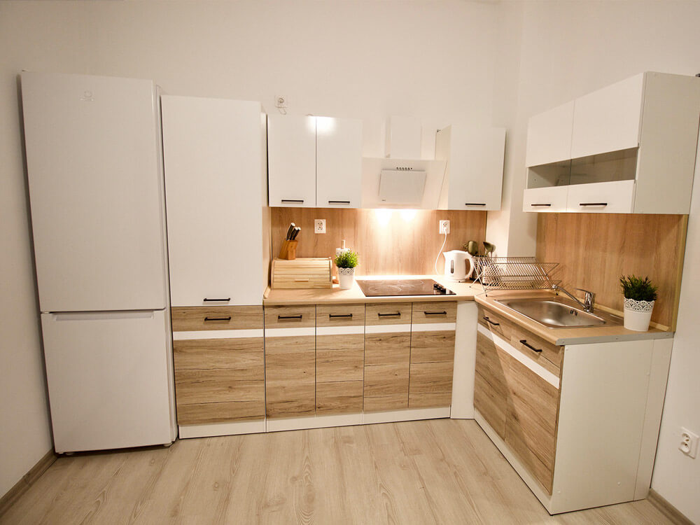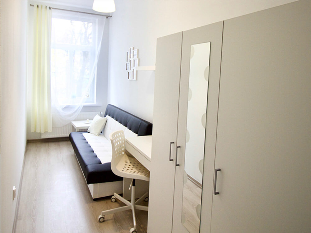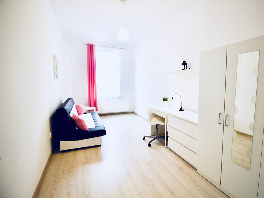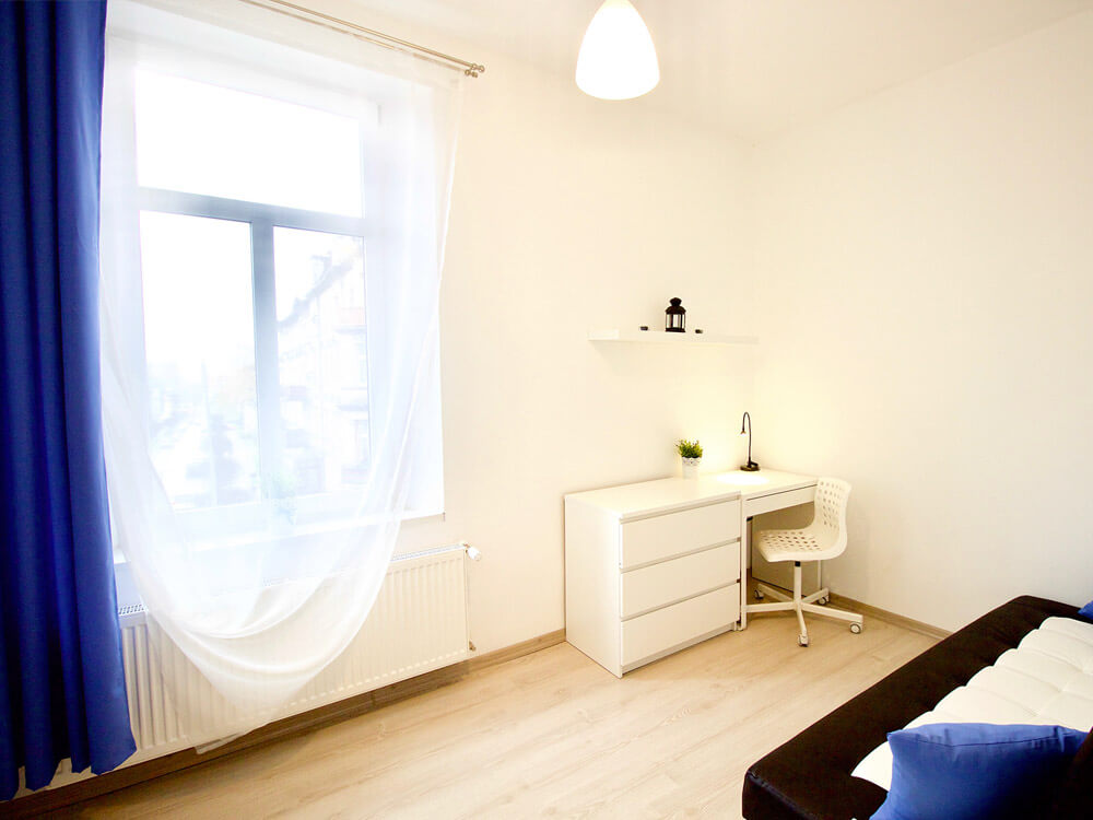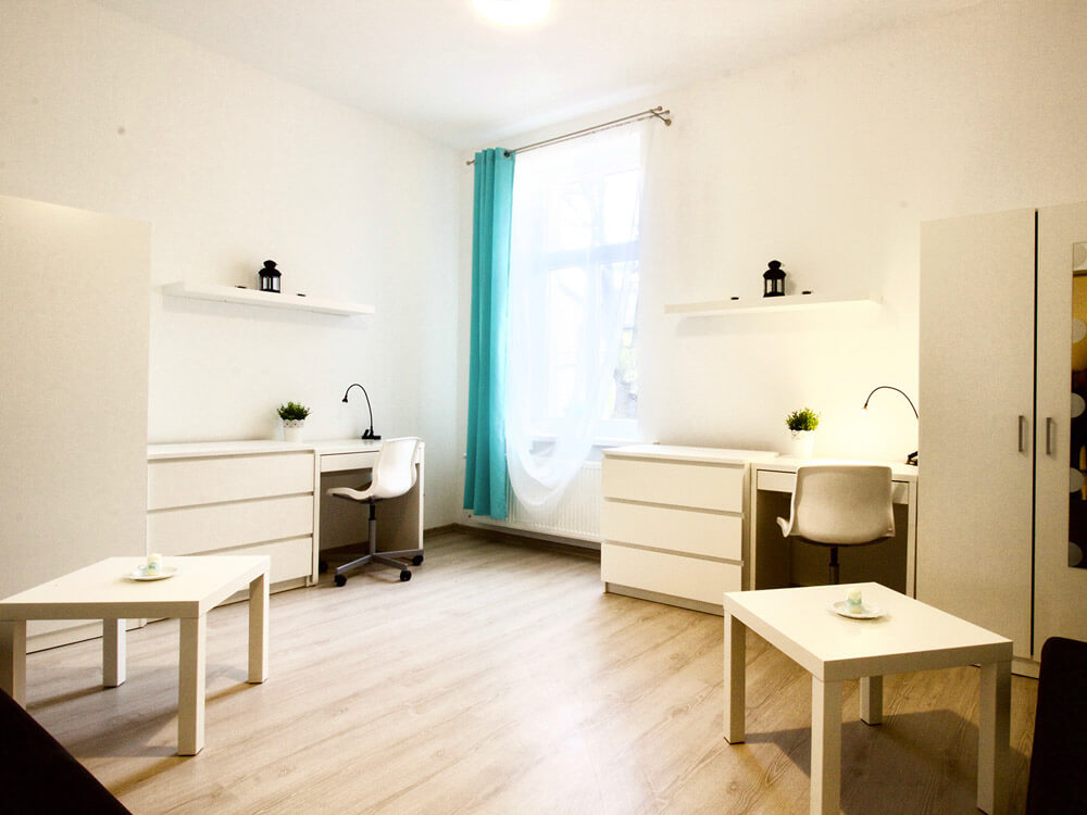 Efektem prac jest 4-pokojowe mieszkanie w pełnym rozkładzie z dużą kuchnią i jadalnią oraz przestronną łazienką. Komfortowe pokoje są w pełni umeblowane, podzielone na część wypoczynkową oraz miejsce do pracy lub nauki. Całe mieszkanie jest utrzymane w kolorach bieli w połączeniu z ciepłym drewnem, a pastelowe akcenty w pokojach są subtelne i delikatne.